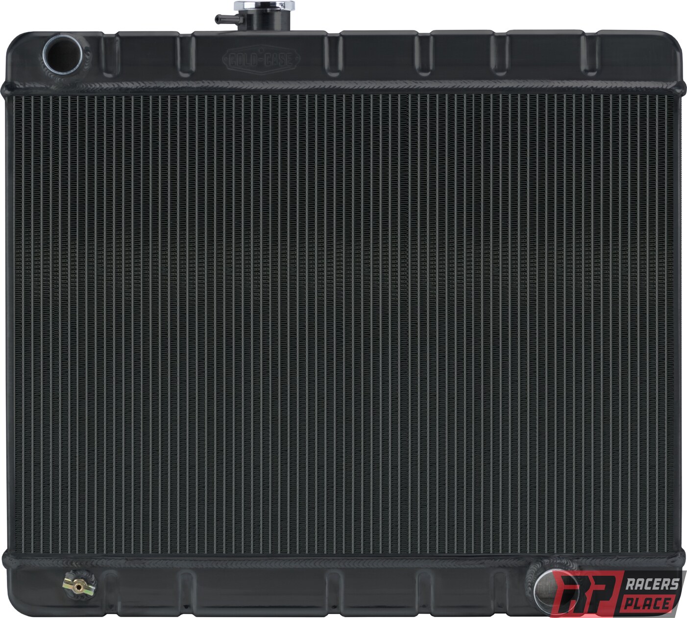 ProduktbeskrivelseRadiator - Black Night Rider Series - 25.25 in W x 20.125 in H x 3 in D - Driver Side Inlet - Passenger Side Outlet - Aluminum - Black Paint - Manual - GM A-Body 1966-67 - Each