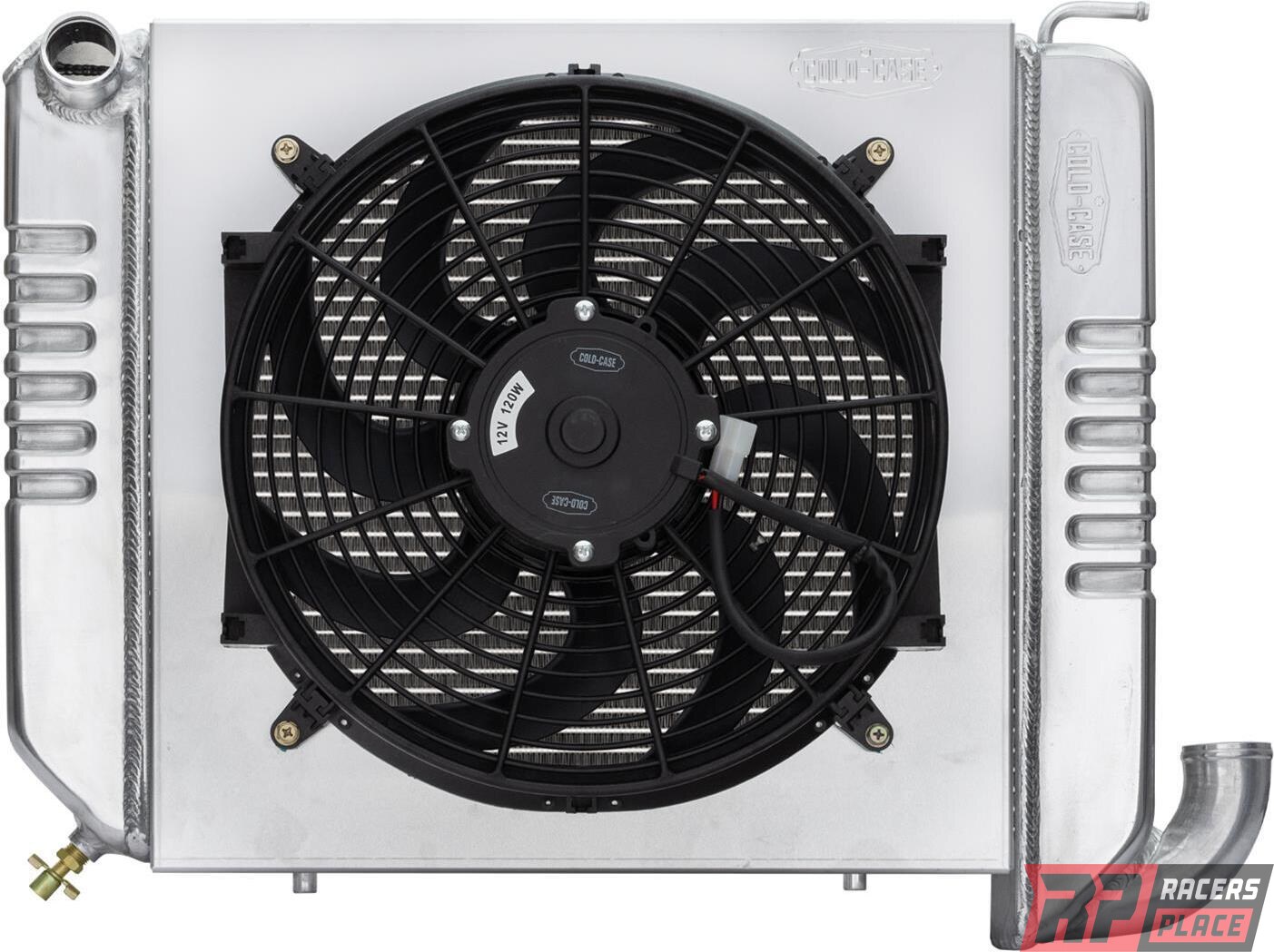 ProduktbeskrivelseRadiator and Fan - 22.6 in W x 18.5 in H x 6.75 in D - Driver Side Inlet - Passenger Side Outlet - Aluminum - Polished - Chevy Corvette 1963-64 - Kit