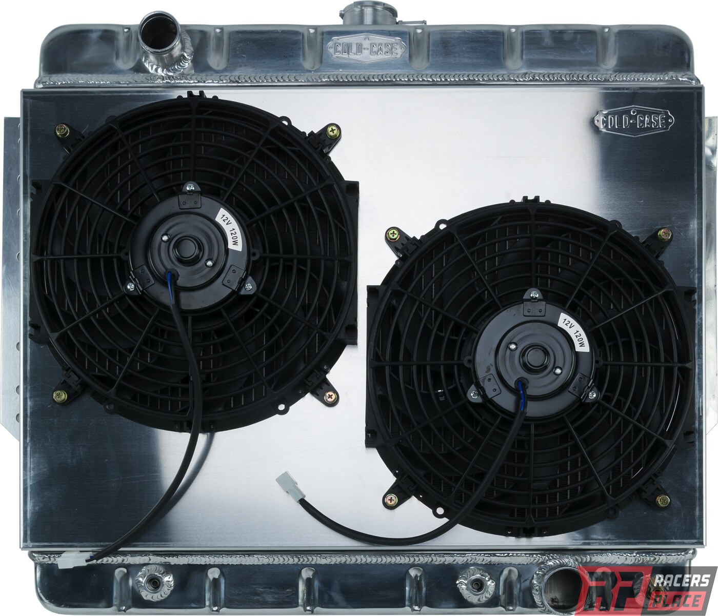 ProduktbeskrivelseRadiator and Fan - 28.75 in W x 23.5 in H x 3 in D - Driver Side Inlet - Passenger Side Outlet - Aluminum - Polished - GM B-Body 1966-68 - Kit