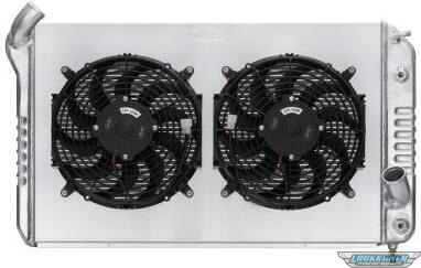 ProduktbeskrivelseRadiator and Fan - 31.75 in W x 19.5 in H x 6.75 in D - Dual Fans - Driver Side Inlet - Passenger Side Outlet - Aluminum - Polished - Chevy Corvette 1969-72 - Kit