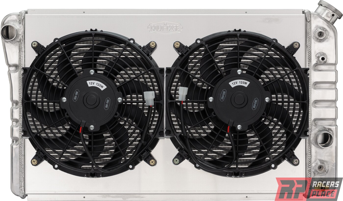 ProduktbeskrivelseRadiator and Fan - 29 in W x 16.5 in H x 6.75 in D - Dual Fans - Driver Side Inlet - Passenger Side Outlet - Aluminum - Polished - Chevy Corvette 1984-90 - Kit