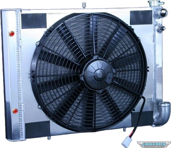 ProduktbeskrivelseRadiator and Fan - Direct Fit - 27.5 in W x 17 in H x 3 in D - Dual Fans - Passenger Side Inlet - Passenger Side Outlet - Aluminum - Natural - Automatic - GM LS-Series - Chevy Corvette 1963-67 - Kit
