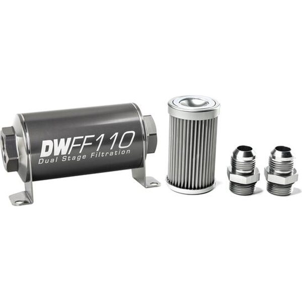 ProduktbeskrivelseFuel Filter - In-Line - 10 Micron - Stainless Element - 10 AN Male Inlet - 10 AN Male Outlet - 110 mm Long - Aluminum - Titanium Anodized - Each