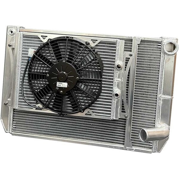 Radiator and Fan - 28.875 in W x 18 in H x 2 in D - Triple Pass - Driver Side Inlet - Passenger Side Outlet - Aluminum - Natural - Ford - Super Late Model - Kit