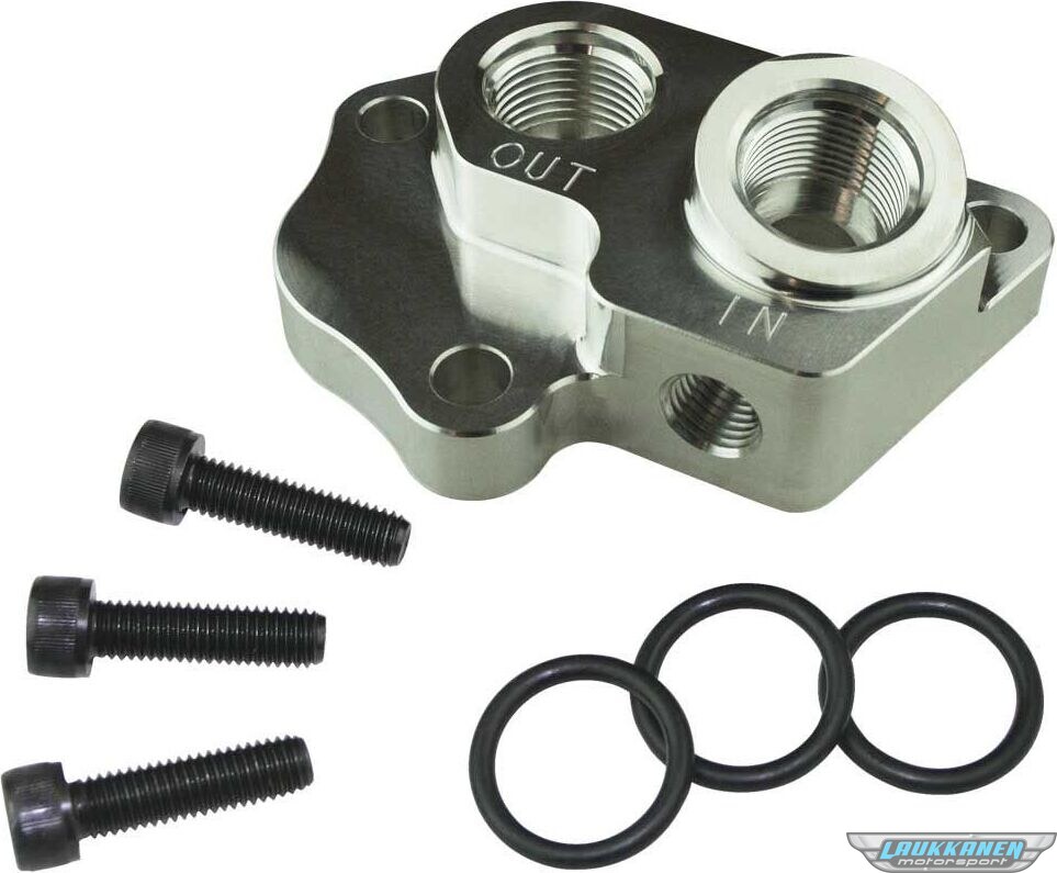 Oil Filter Adapter - Bypass - Bolt-On - 10 AN Female Inlet - 10 AN Female Outlet - 1/4 in NPT Female Port - Aluminum - Black Anodized - Ford Coyote - Each