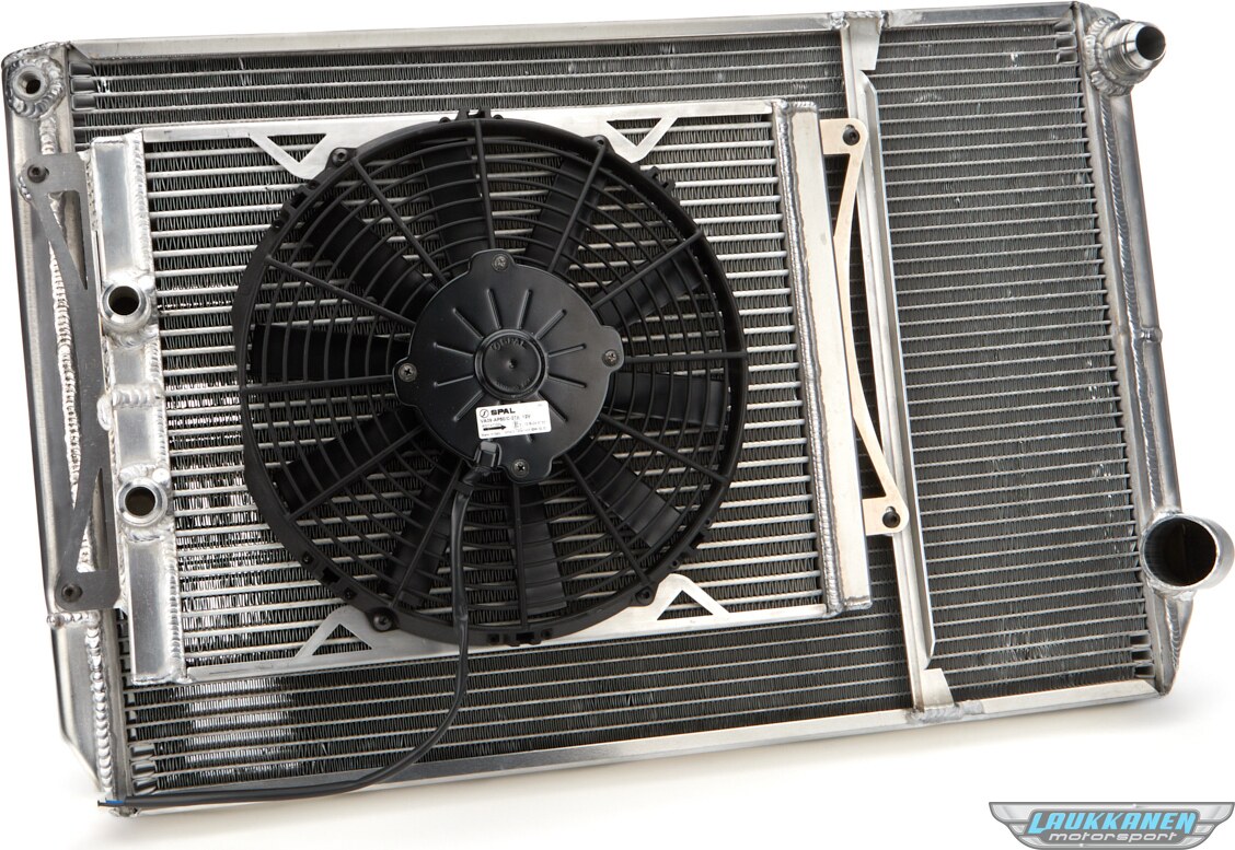 Product descriptionRadiator and Fan - 29 in W x 18.25 in H x 2 in D - Dual Pass - Passenger Side Inlet - Passenger Side Outlet - Aluminum - Natural - Kit