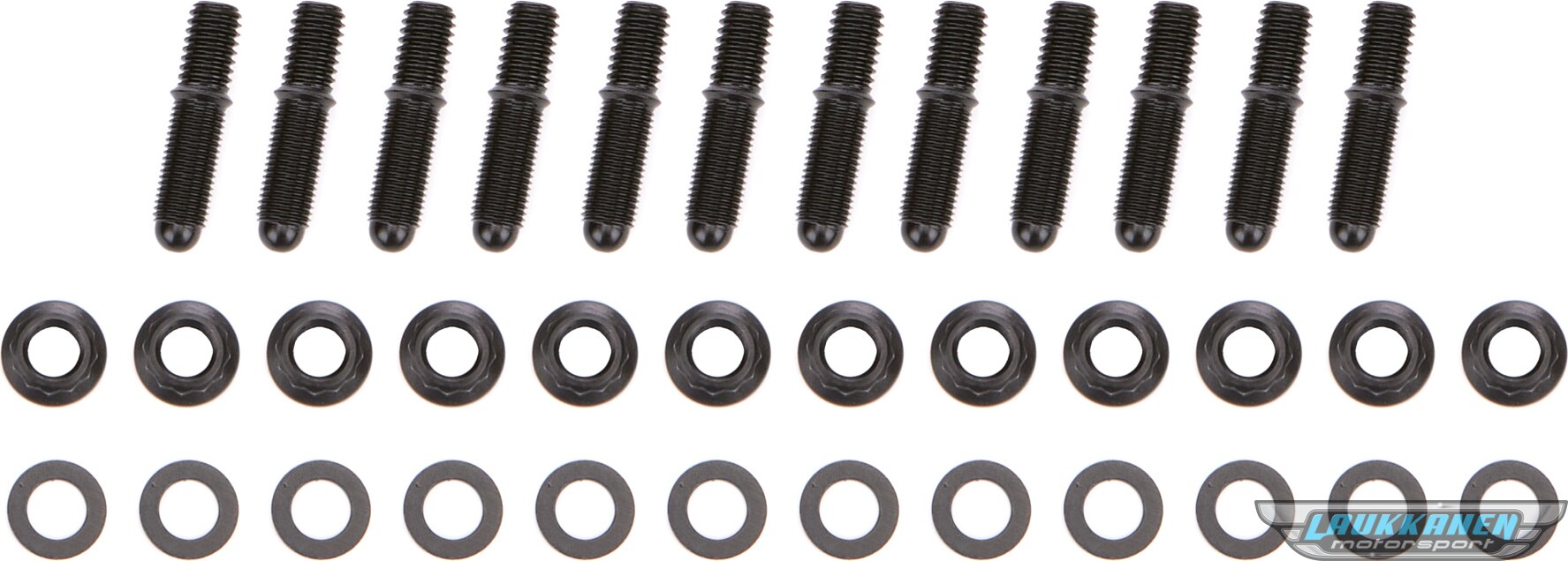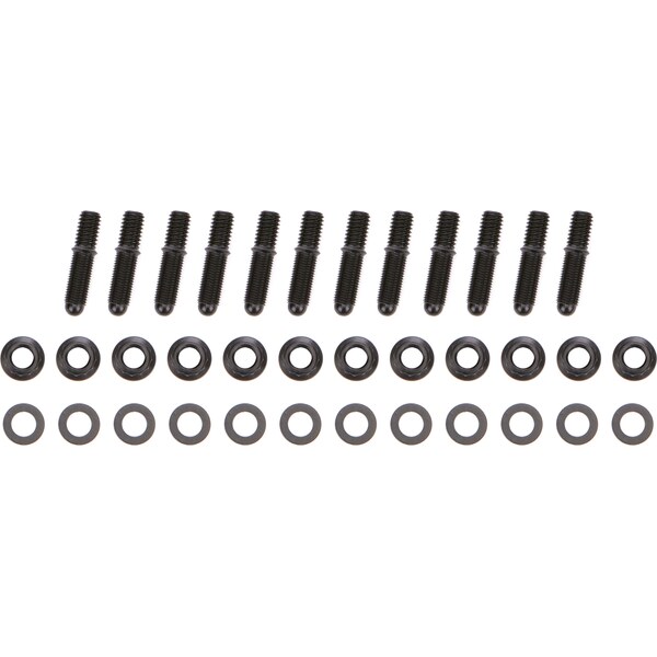 DescripciónHeader Stud - 3/8-16 and 3/8-24 in Thread - 1.675 in Long - Nuts Included - Broached - Steel - Black Oxide - Small Block Chevy - Set of 12