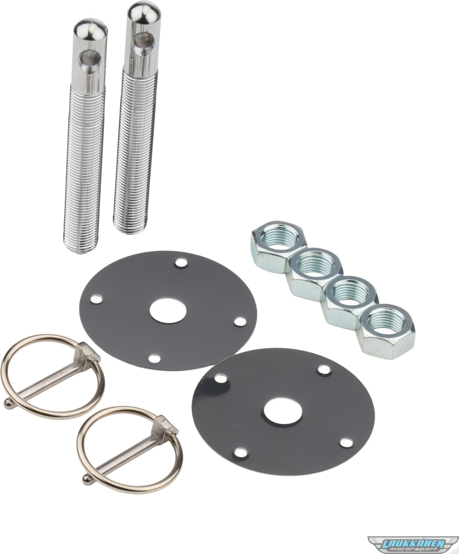 DescripciónHood Pin - 1/2 in OD x 4 in Long - 2-1/2 in OD Scuff Plates - Torsion Clips - Hardware Included - Steel - Chrome - Kit