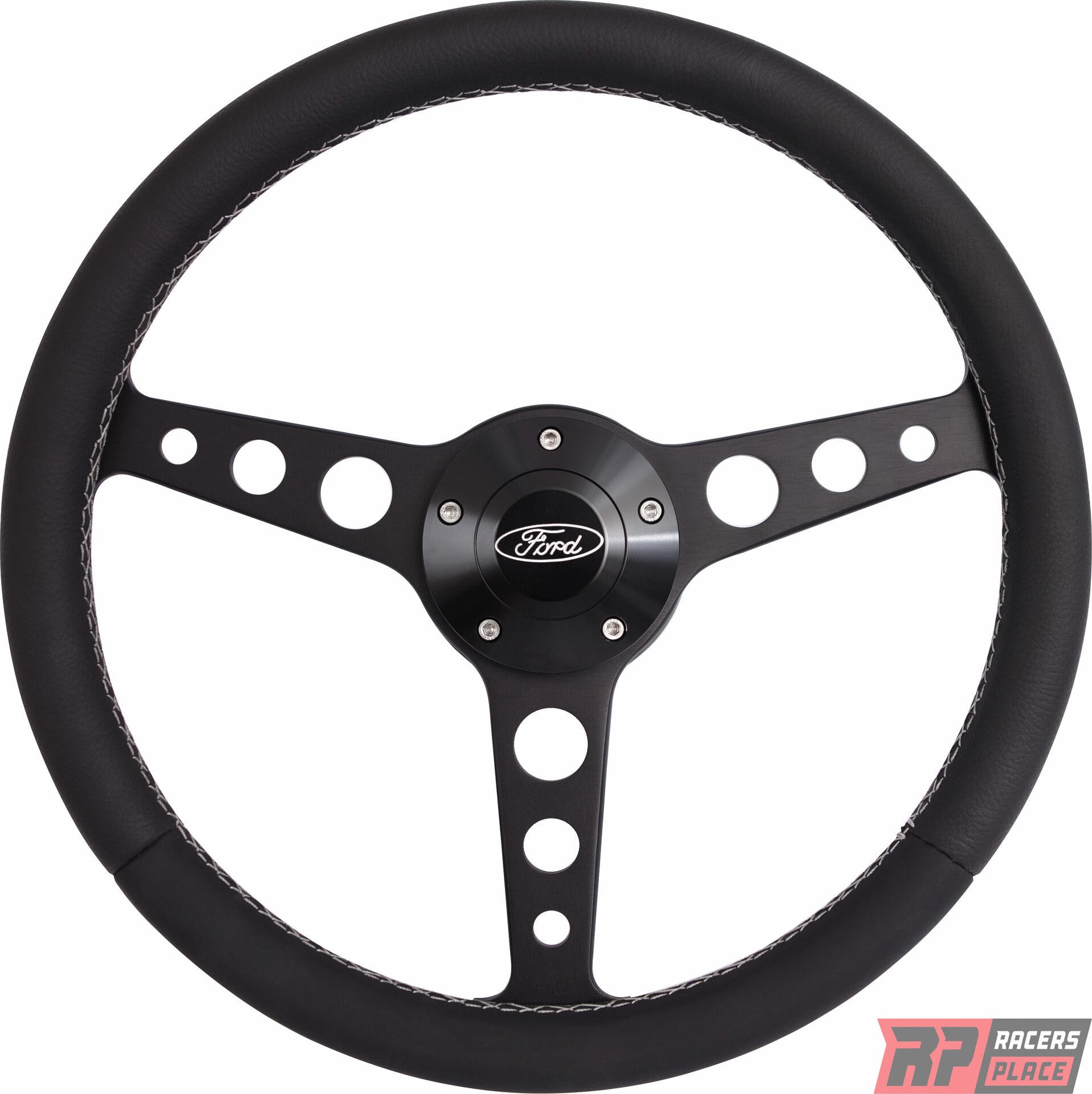 Steering Wheel - Classic Series - 13.75 in Diameter - Flat - 3-Spoke - Black Leather Grip - Ford Oval Logo - Aluminum - Black Anodized - Ford 1969-91 - Each