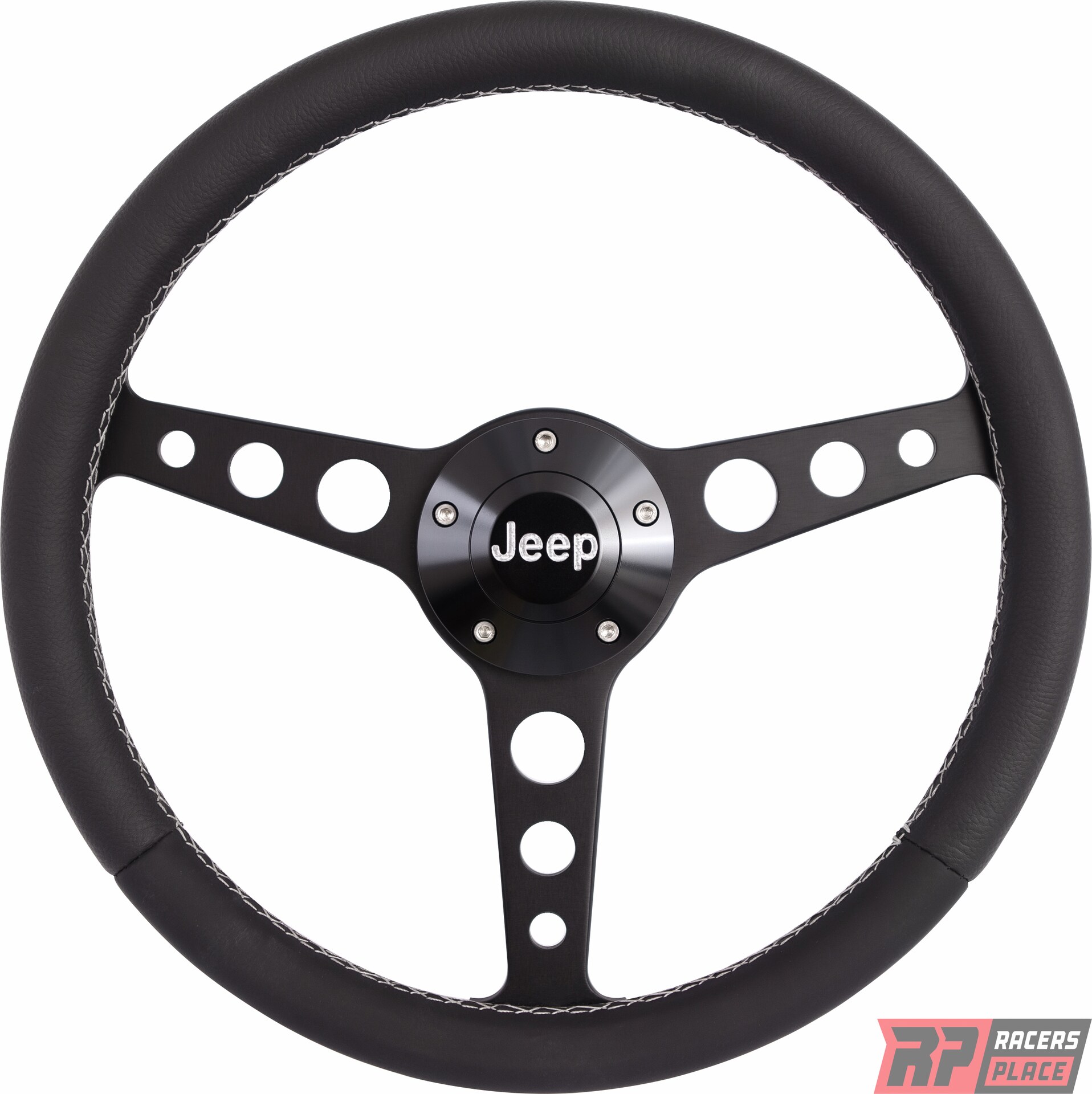 Steering Wheel - Classic Series - 13.75 in Diameter - Flat - 3-Spoke - Black Leather Grip - Jeep Logo - Aluminum - Black Anodized - Jeep 1974-95 - Each