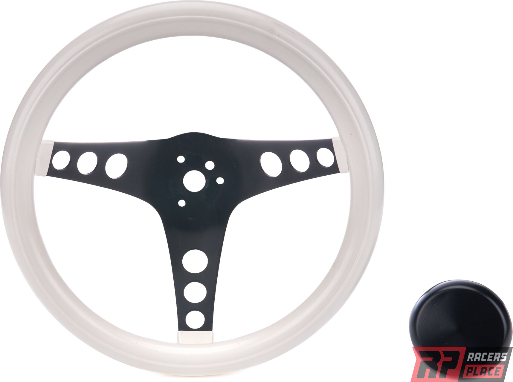 Toote kirjeldusSteering Wheel - Classic Series - 11.5 in Diameter - 3.75 in Dish - 3-Spoke - White Foam Grip - Steel - Black Paint - Each