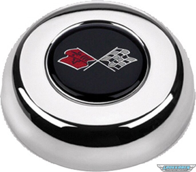 Toote kirjeldusHorn Button - Black / Red / Silver Corvette Flags Logo - Steel - Chrome - Grant Classic / Challenger Series Wheels - Each