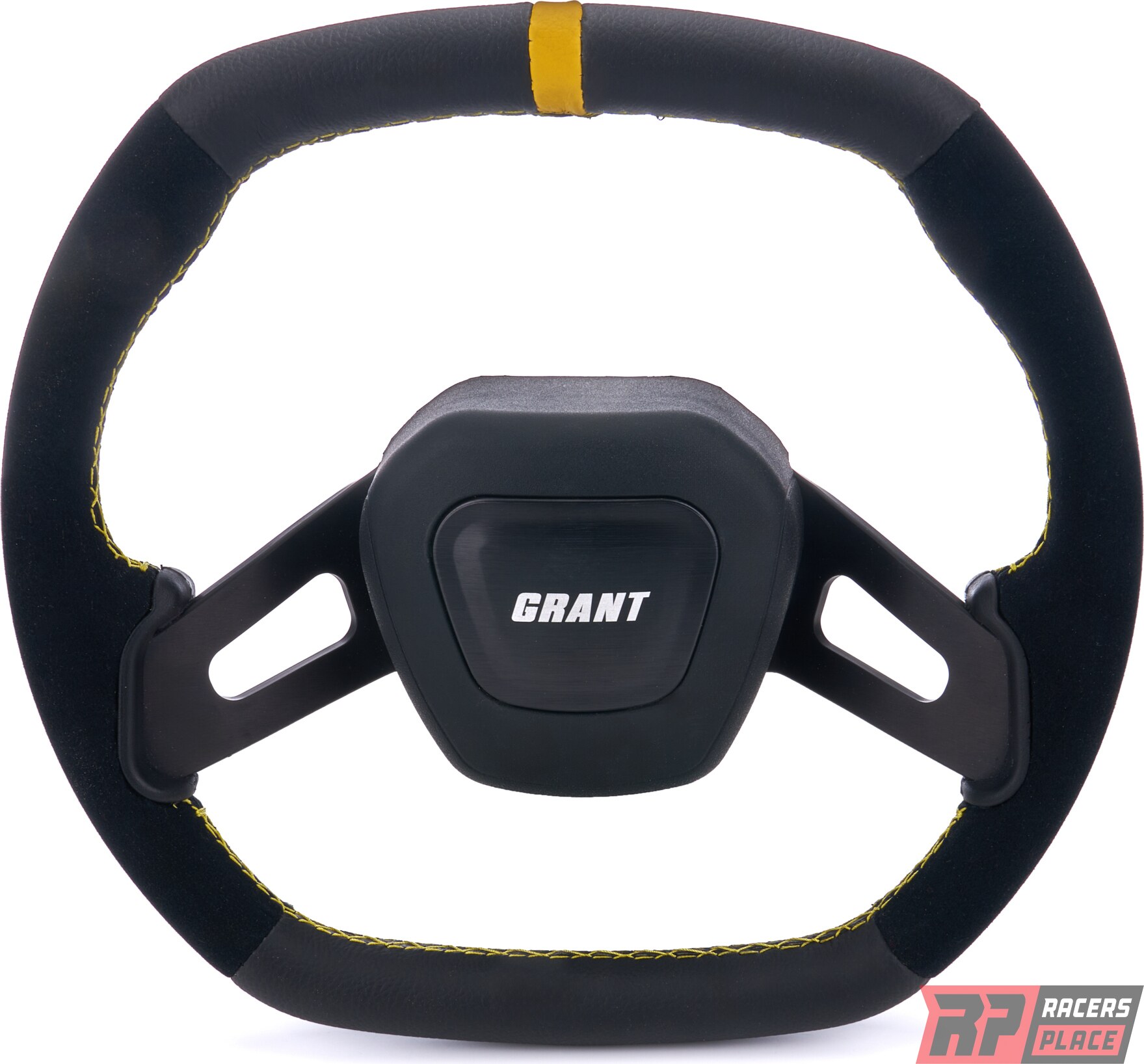 Toote kirjeldusSteering Wheel - Performance Series - 13.7 x 12.7 in Diameter - 1 in Dish - 2-Spoke - Black Leather / Suede Grip - Yellow Stripe - Aluminum - Black Anodized - Each