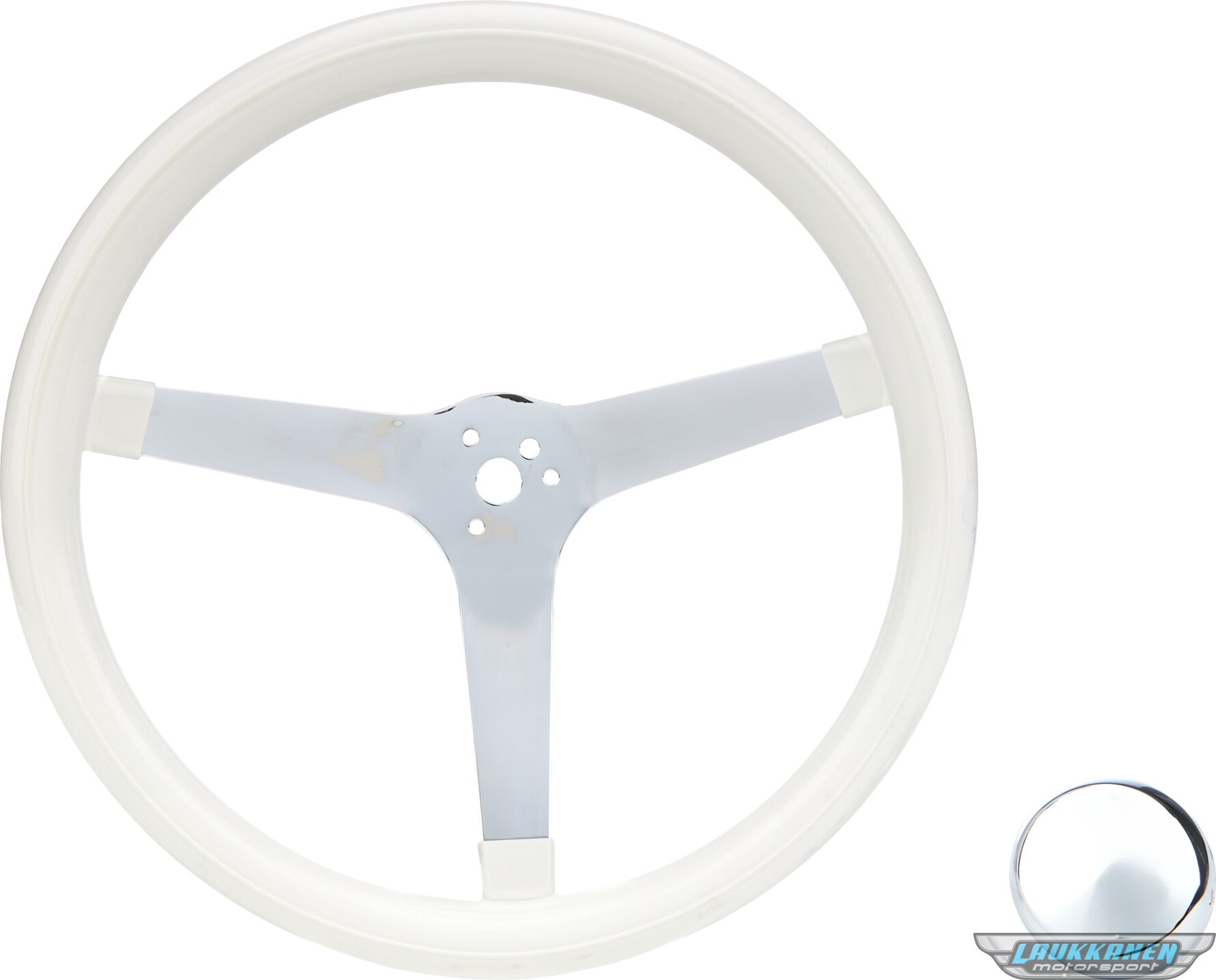 Toote kirjeldusSteering Wheel - Classic Series - 14.75 in Diameter - 3.5 in Dish - 3-Spoke - White Foam Grip - Steel - Chrome - Each