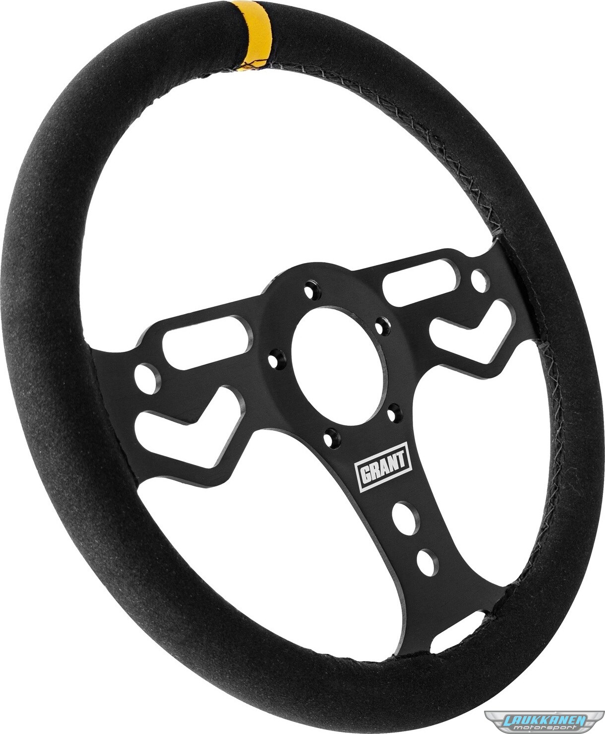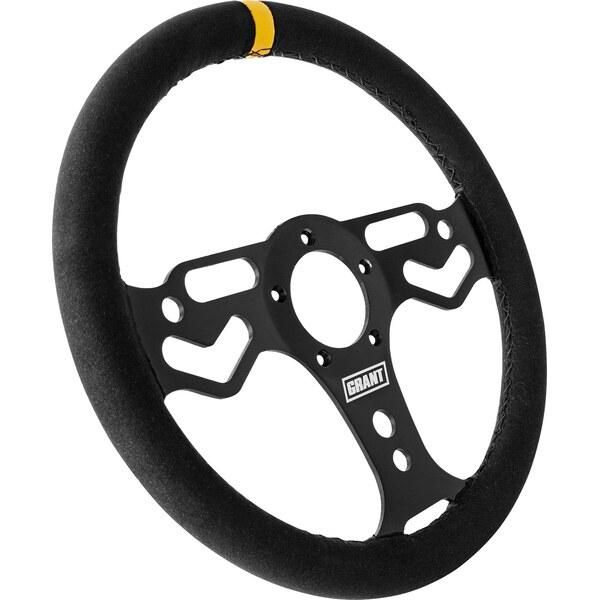 Produkt beskrivelseSteering Wheel - Pro Stock - 13 in Diameter - 1.1 in Dish - 3-Spoke - Black Suede Grip - Yellow Stripe - Aluminum - Black Anodized - Each