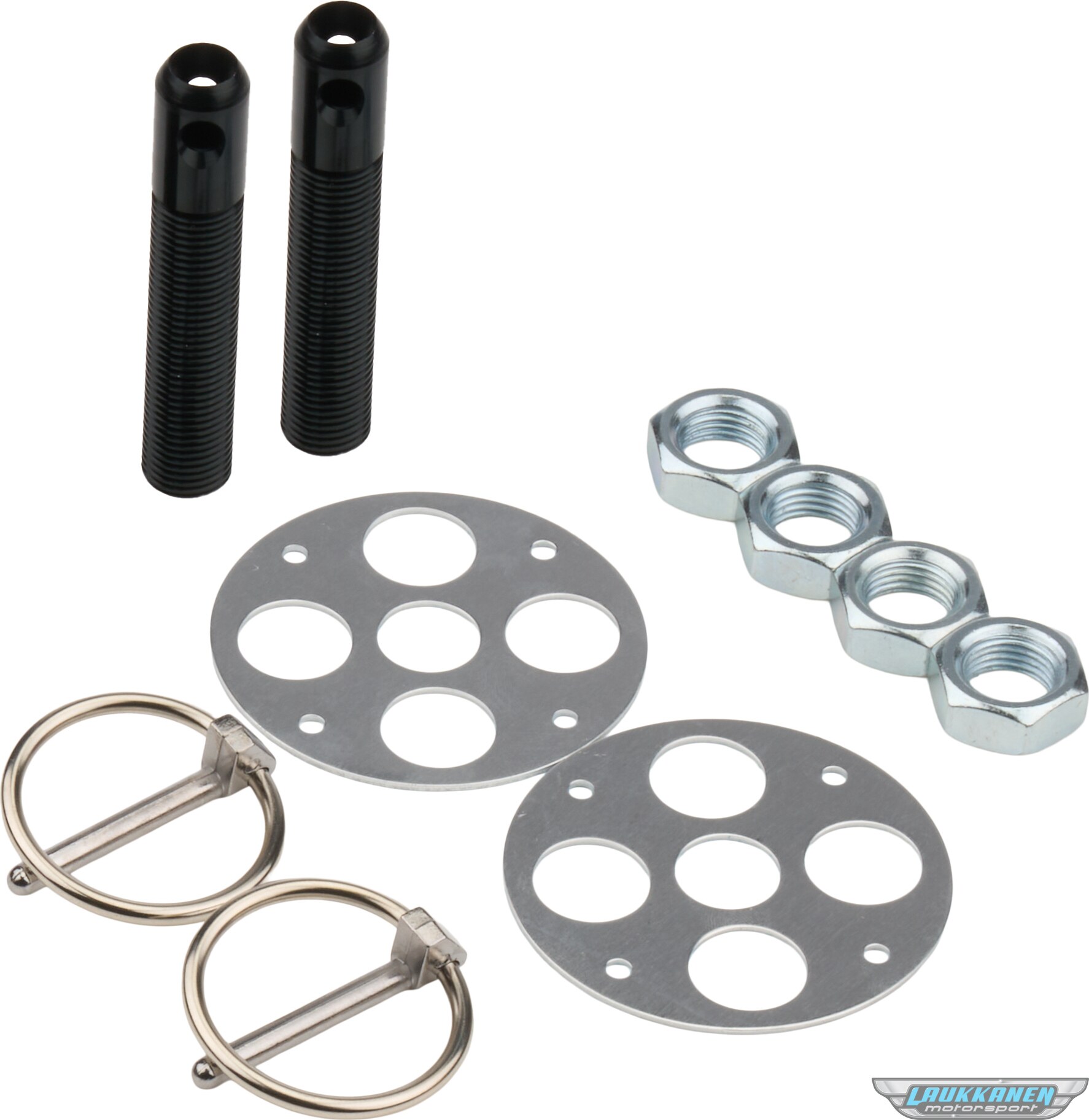 Hood Pin - Lightweight - 1/2 in OD x 2-3/4 in Long - 1-5/8 in OD Scuff Plates - Torsion Clips - Hardware Included - Gun Drilled - Aluminum - Black Anodized - Kit
