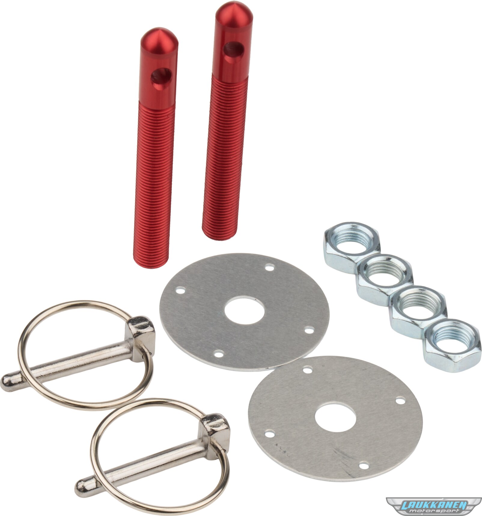Hood Pin - 1/2 in OD x 4 in Long - 2-1/4 in OD Scuff Plates - Torsion Clips - Hardware Included - Aluminum - Red Anodized - Kit