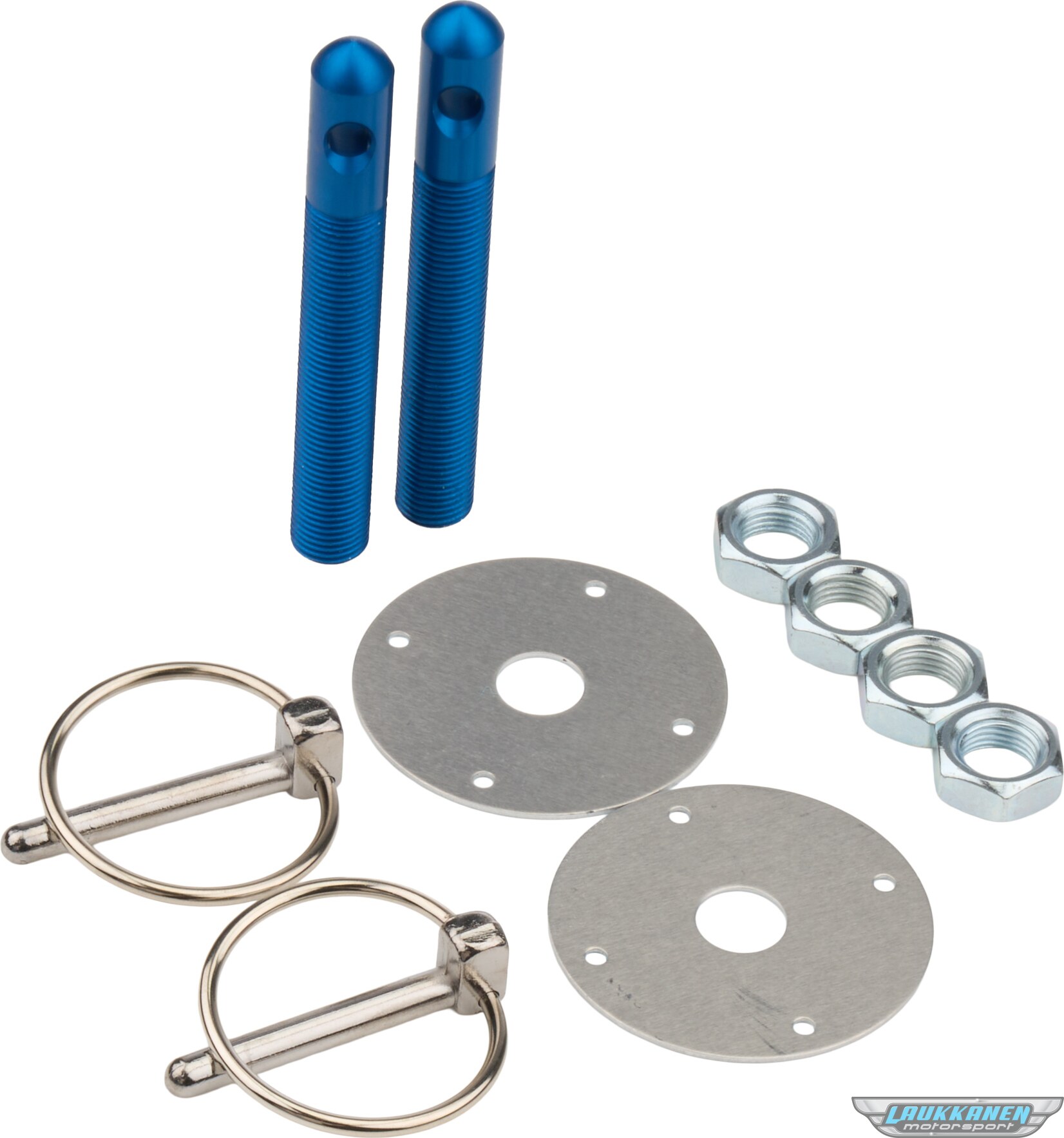 Hood Pin - 1/2 in OD x 4 in Long - 2-1/4 in OD Scuff Plates - Torsion Clips - Hardware Included - Aluminum - Blue Anodized - Kit