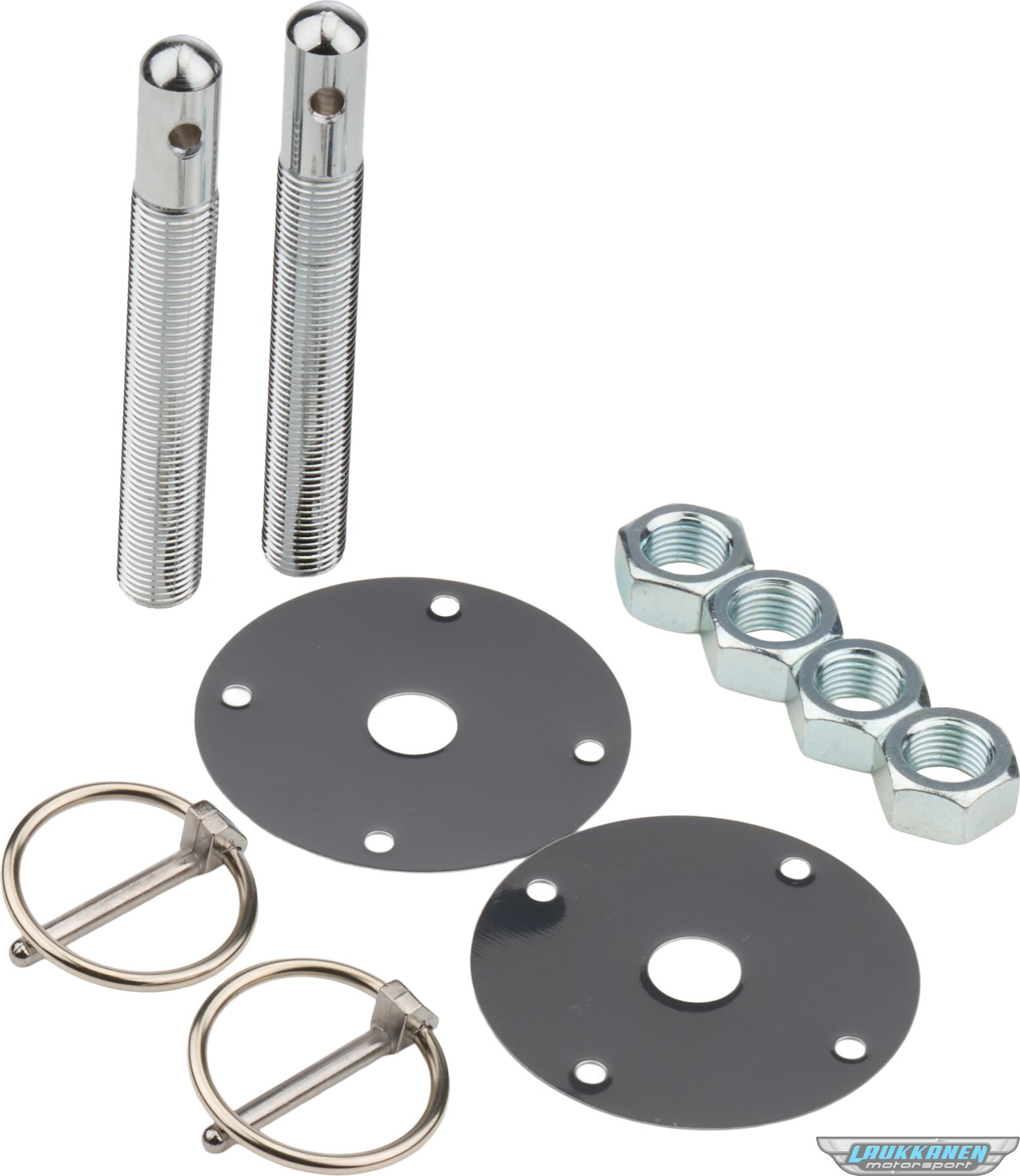 Hood Pin - 1/2 in OD x 4 in Long - 2-1/2 in OD Scuff Plates - Torsion Clips - Hardware Included - Steel - Chrome - Kit