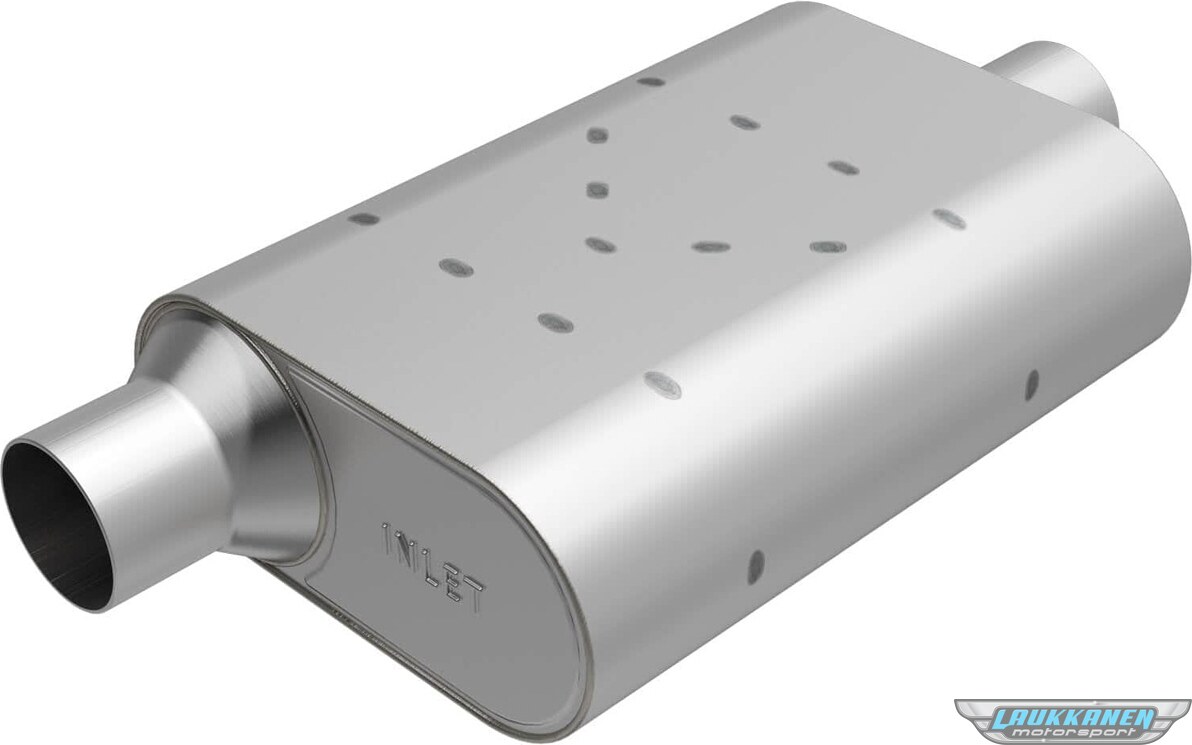 ProduktbeskrivningMuffler - Rumble - 3 in Offset Inlet - 3 in Center Outlet - 13 x 4-1/4 x 9-1/2 in Oval Body - 18-1/2 in Long - Stainless - Natural - Universal - Each