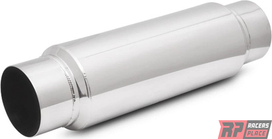 ProduktbeskrivningMuffler - Race - 3-1/2 in Inlet - 3-1/2 Outlet - 5 in Diameter Body - 18 in Long - Stainless - Natural - Each