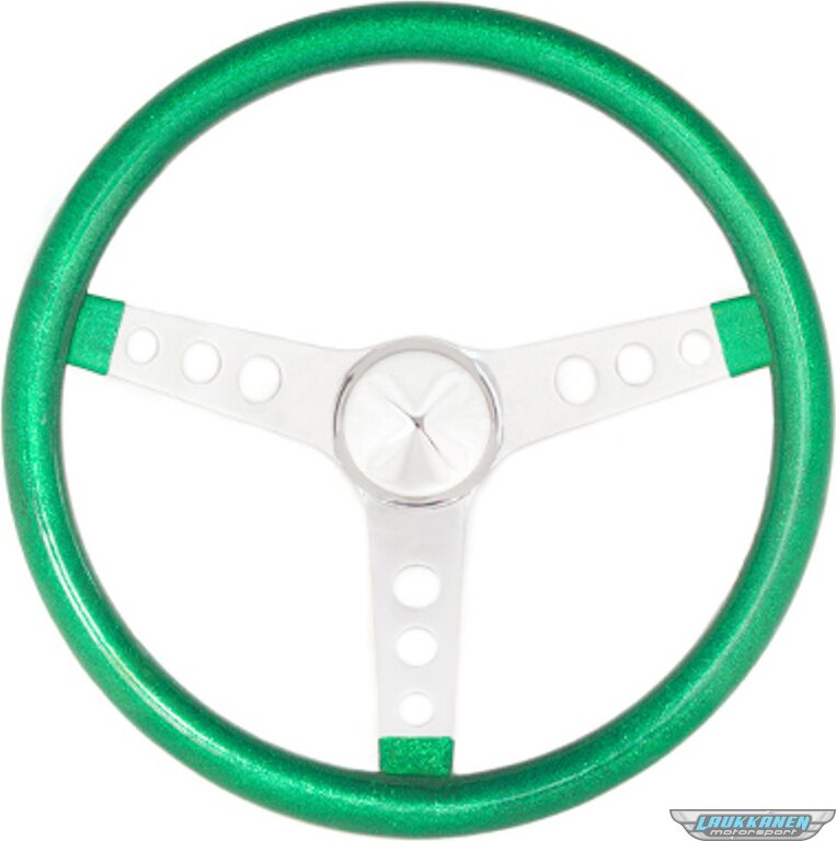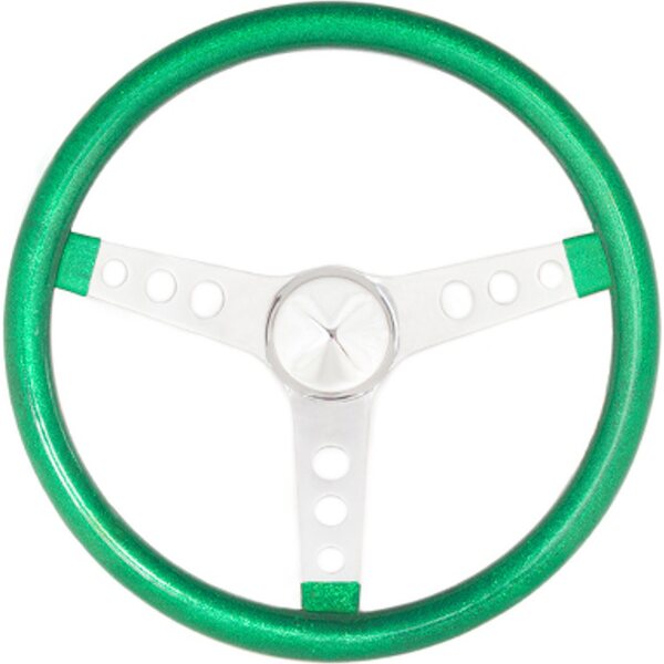 ProduktbeskrivningSteering Wheel - Metal Flake - 15 in Diameter - 1.5 in Dish - 3-Spoke - Green Metal Flake Grip - Steel - Chrome - Each